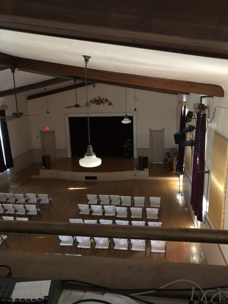 The picture below is the main part of the basement without the lights on so this is just lite by the windows. The tables down here are donated and very heavy units so we request that you do not move them upstairs. The basement seats 75 easily and the small alcove in the back of the room is quite short as it has a step up so it would work to put up a small screen for a project if you need to.